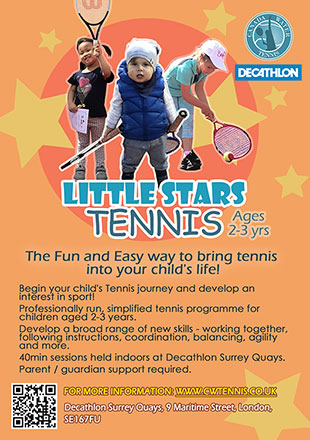 Begin your child's Tennis journey and develop an interest in sport! We are proud to introduce a new and professionally run, simplified tennis programme for children aged 2-3 years. By using fun interactive games we aim to develop a broad range of new skills - working together, following instructions, coordination, balancing, agility and more. - 40min sessions held indoors at Decathlon Surrey Quays 1st floor Sports studio. - Parent / guardian support required. - Sportswear is recommended. - All tennis equipment will be provided. Is your child the next big tennis sensation? Book early to avoid disappointment! |