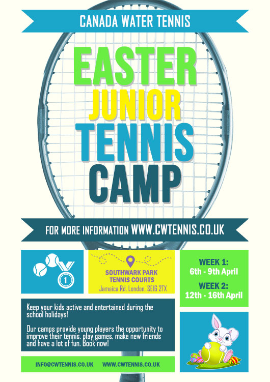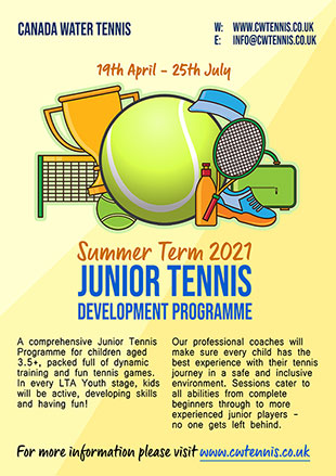 Our tennis camp gives young players the perfect environment to develop their skills and enjoy the game! At Canada Water Tennis we guide players through a wide variety of techniques and offer one of the very best tennis coaching. Your children will be active, learning proper tennis techniques and staying on top of their game. We cater to all standards of junior players from complete beginners to more experienced players. All junior tennis players aged 3.5 to 9+ years old are invited to come along to experience a variety of exciting tennis activities. Give your children a fun-filled holiday! Please see term programme flyer for more details. To book a place please visit Online Bookings page or email us. |